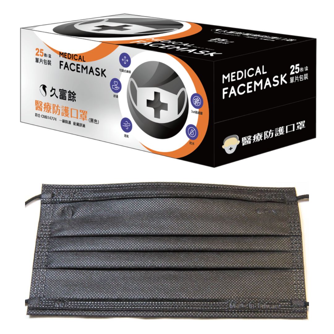 久富餘成人平面醫用口罩25片/盒∣曜石黑