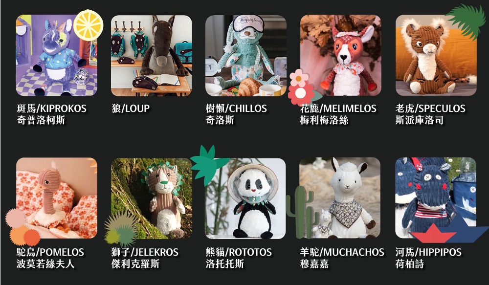 Déglingos森林王國裡有自己的官方語言,其中包括用«os»完成許多單字,在那兒充滿歡樂、歡笑和幸福,這就是Déglingos的生活方式!Déglingos是擁有一群有趣而可愛動物的大家庭,讓父母在編織動物們的故事時,透過角色讓孩子們認識獨特而強烈的世界觀~