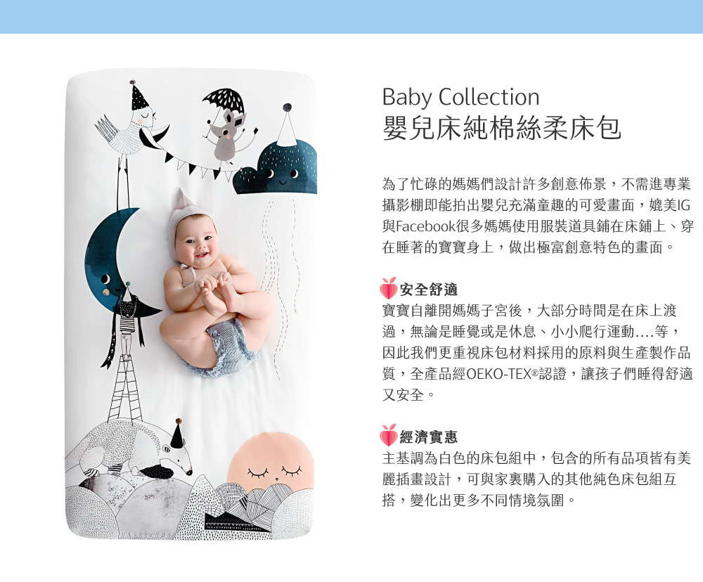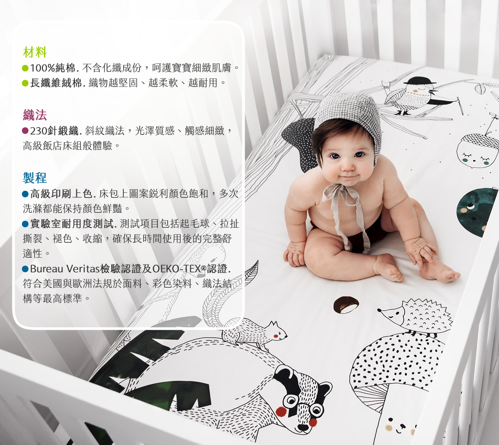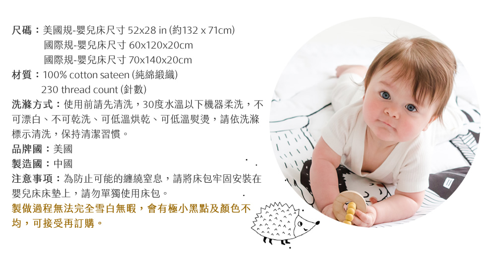 注意事項:為防止可能的纏繞窒息,請將床包牢固安裝在嬰兒床床墊上,請勿單獨使用床包,製做過程無法完全雪白無暇,會有極小黑點及顏色不均為正常現象