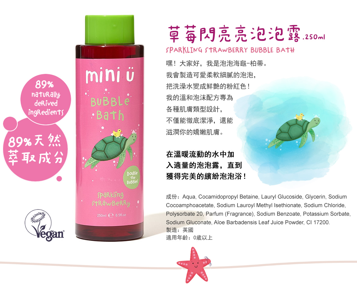 這個可重複使用的禮品袋內含 mini U 天然萃取的草莓閃亮亮泡泡露,專為創造最豐富的粉色泡泡浴而設計,可以潔淨並保濕各類型的肌膚,還有一個不易染色和弄髒浴盆的沐浴爆爆美人魚尾,碰到水時會爆發出泡泡和樂趣