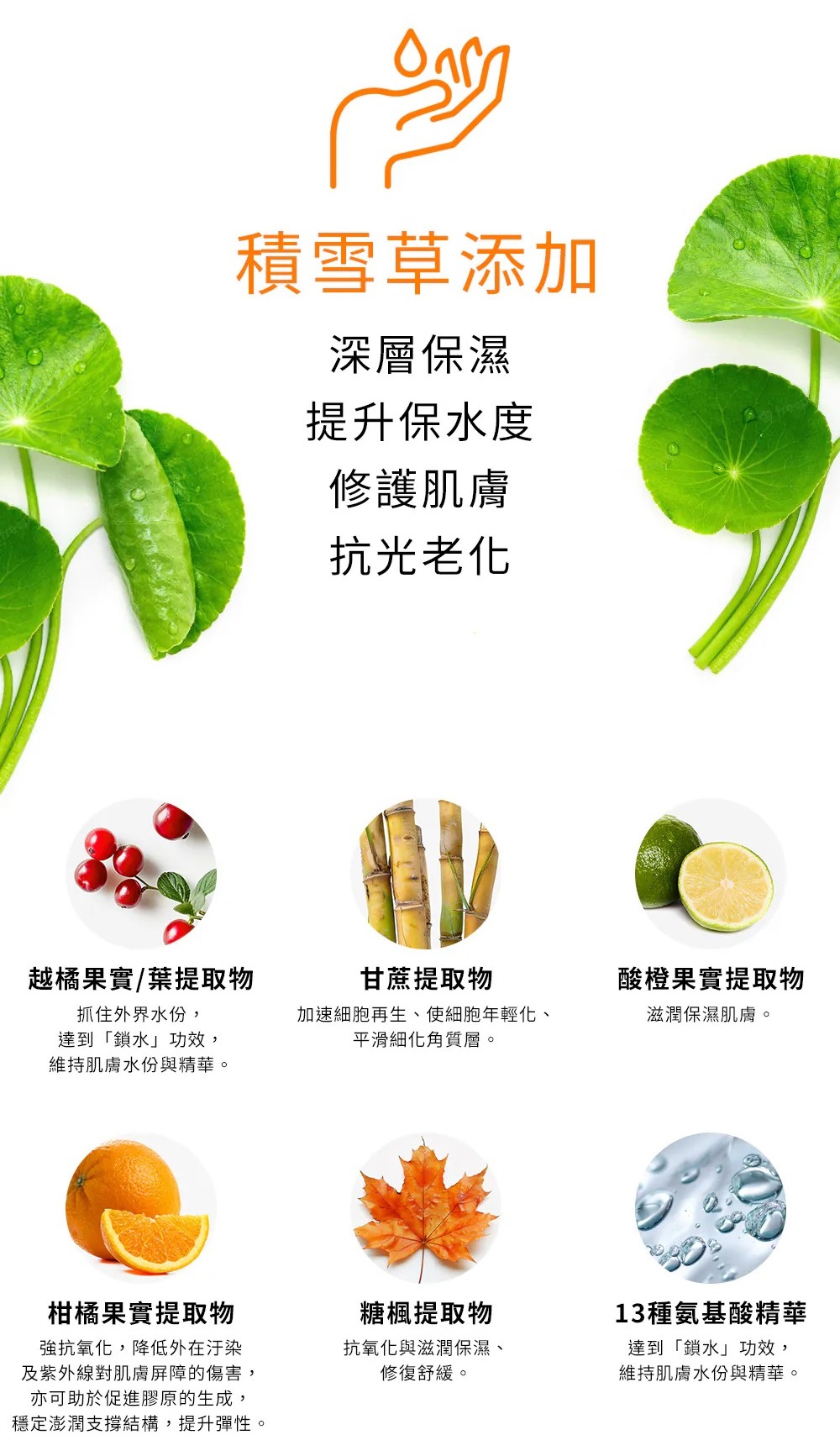 ◆ 積雪草成分添加,深層保濕,提升保水度,修護肌膚,抗光老化